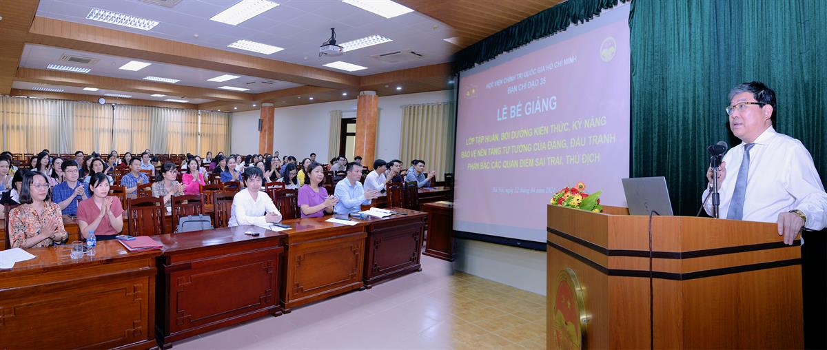 Chiều 12/4/2024, Học viện Chính trị quốc gia Hồ Chí Minh tổ chức bế giảng Lớp tập huấn, bồi dưỡng kiến thức, kỹ năng bảo vệ nền tảng tư tưởng của Đảng, đấu tranh phản bác các quan điểm sai trái, thù địch (Lớp thứ nhất), dành cho đội ngũ cán bộ, giảng viên Học viện Chính trị quốc gia Hồ Chí Minh, các Học viện trực thuộc và các trường chính trị tỉnh, thành phố khu vực phía Bắc. PGS,TS Nguyễn Duy Bắc, Phó Bí thư Đảng ủy, Phó Giám đốc thường trực Học viện, Phó Trưởng Ban Ban Chỉ đạo 35 Học viện Chính trị quốc gia Hồ Chí Minh dự và chủ trì Lễ bế giảng.