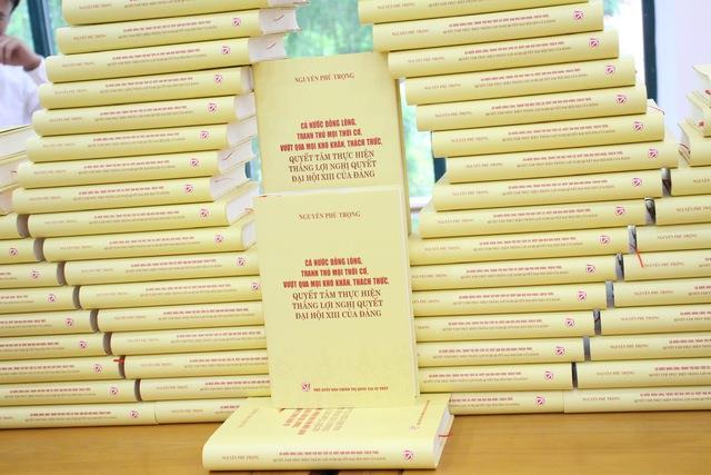 | Cuốn sách "Cả nước đồng lòng, tranh thủ mọi thời cơ, vượt qua mọi khó khăn, thách thức, quyết tâm thực hiện thắng lợi Nghị quyết Đại hội XIII của Đảng" của Tổng Bí thư Nguyễn Phú Trọng trưng bày tại buổi lễ |